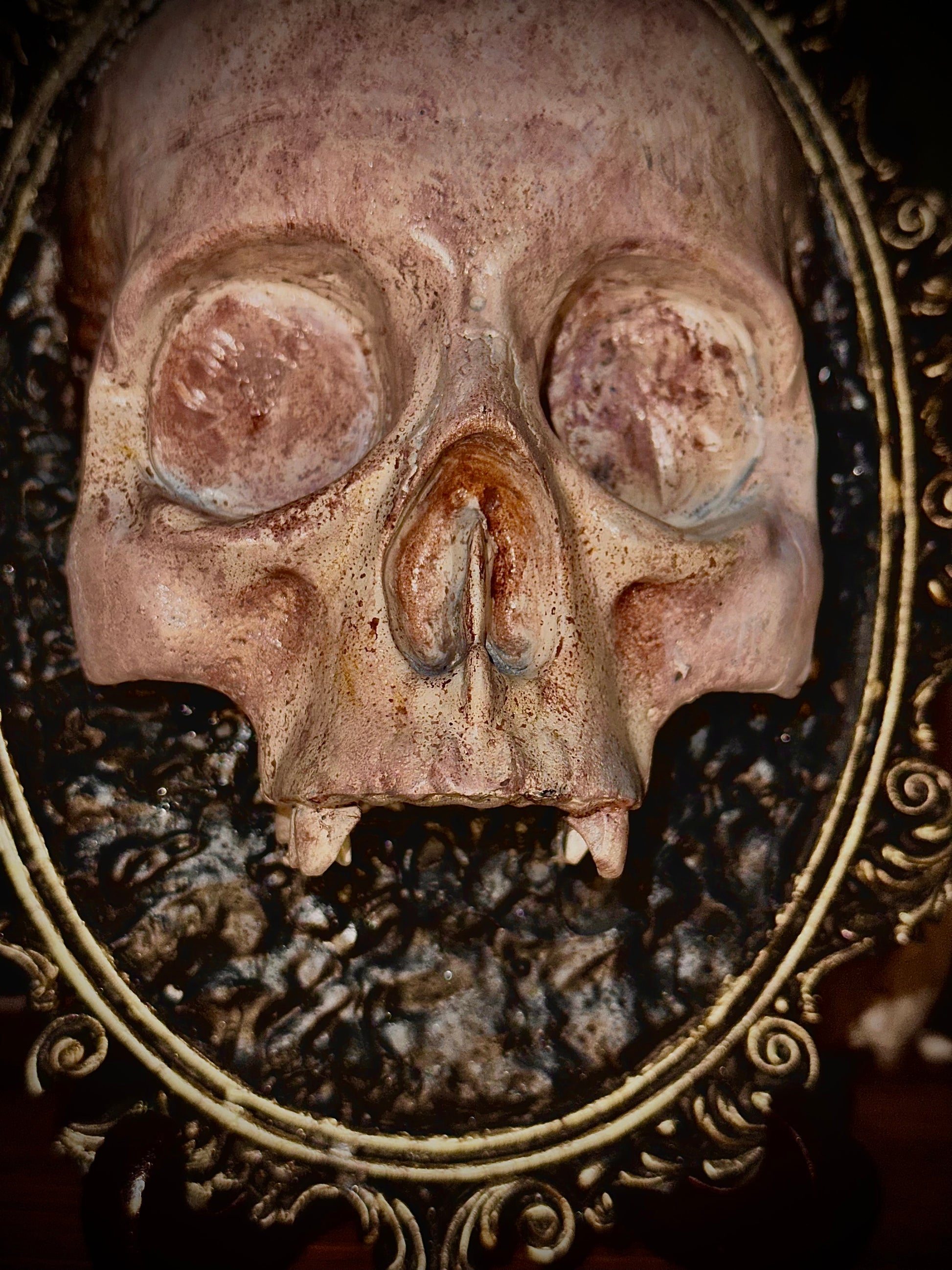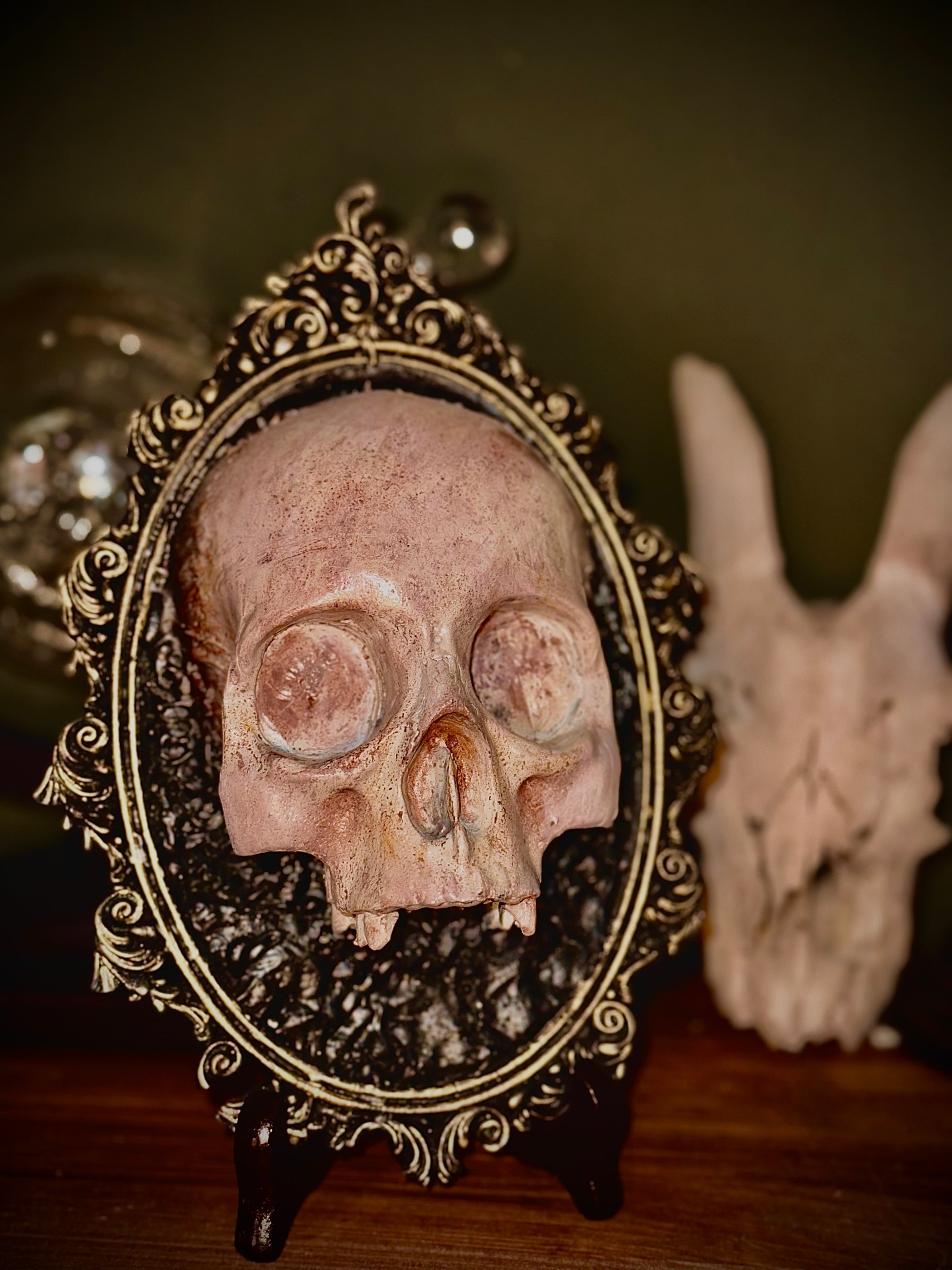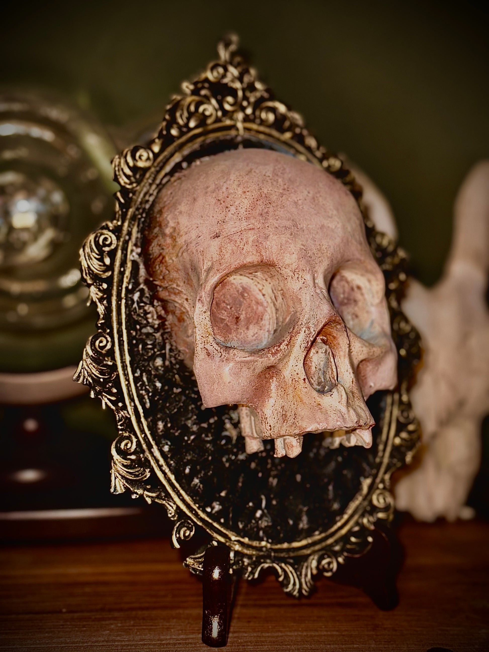 Elegante composizione in resina con cornice barocca finemente decorata. Al centro domina un teschio simbolico, richiamo alla caducità della vita.
