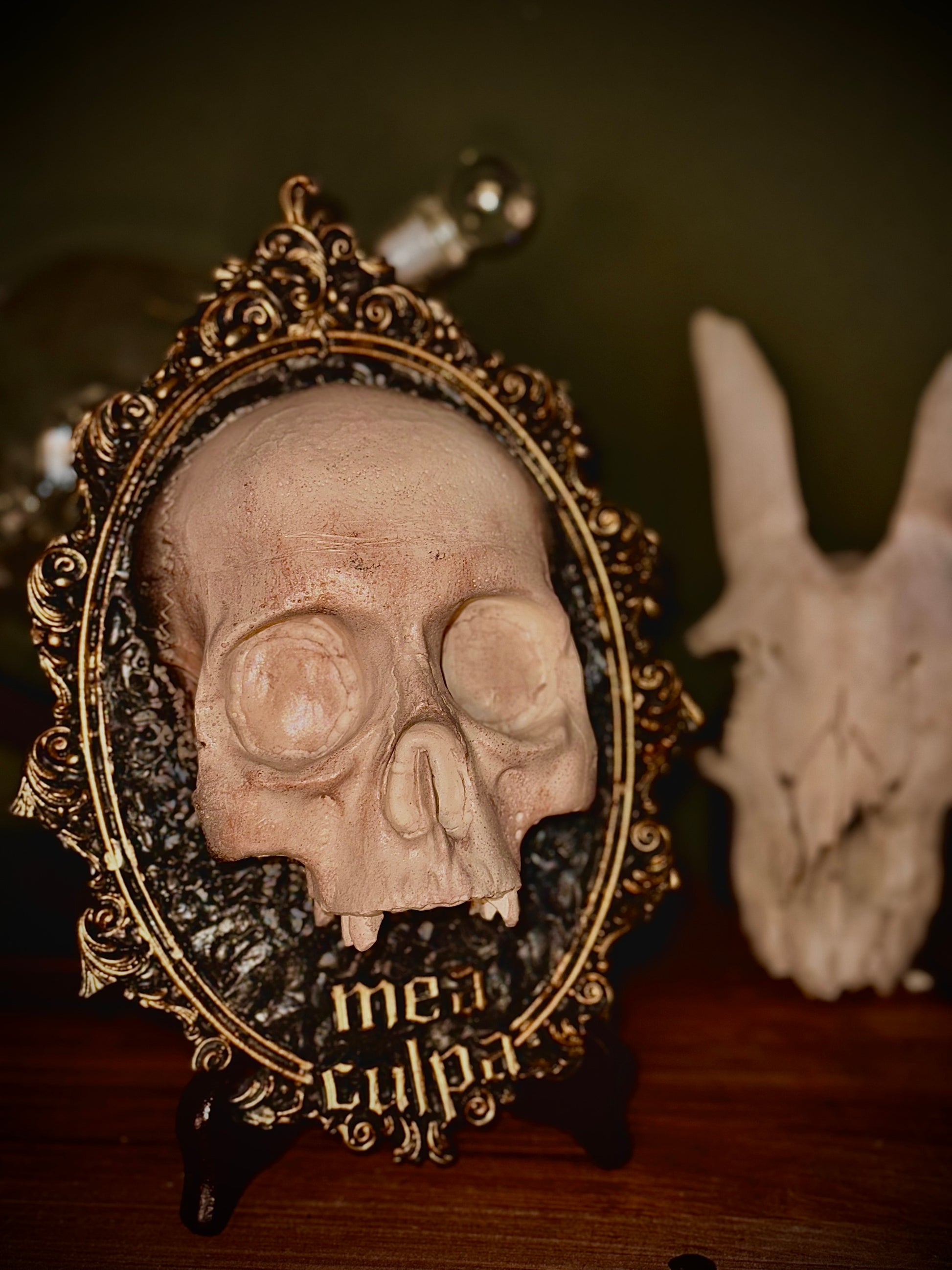 Elegante composizione in resina con cornice barocca finemente decorata. Al centro domina un teschio simbolico, richiamo alla caducità della vita, accompagnato dall'iscrizione "Mea culpa" , che richiama il tema dell'introspezione e della responsabilità personale.